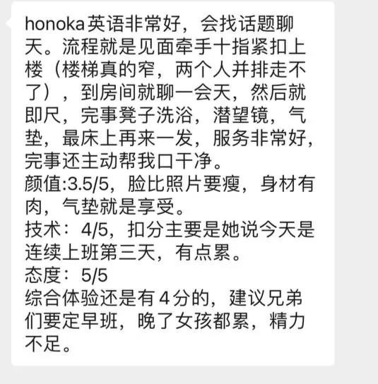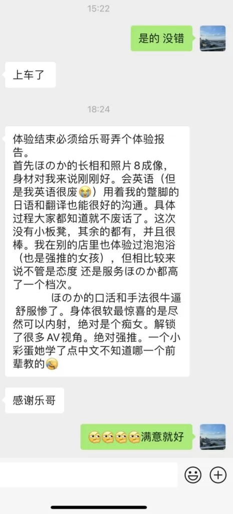 HONOKA的服务是目前体验到所有泡姬里面最全的一位选手,基本上泡泡浴能想到的服务她这里都会有,同时默认无套可以内射。但是颜值和身材水分是比较大的,颜值上她的下半部分脸偏长,嘴巴不是很好看。身材上她的胸型相对一般,胸的上半部分有一点瘪,并且整体也没有官网写的H杯这么大。个人感觉大概在国内的C杯左右。属于女友系泡姬,会一直缠着你撒娇,给足情绪价值。英语水平也不错,沟通起来很顺畅。