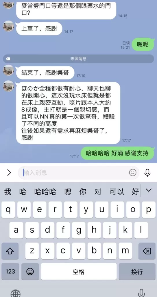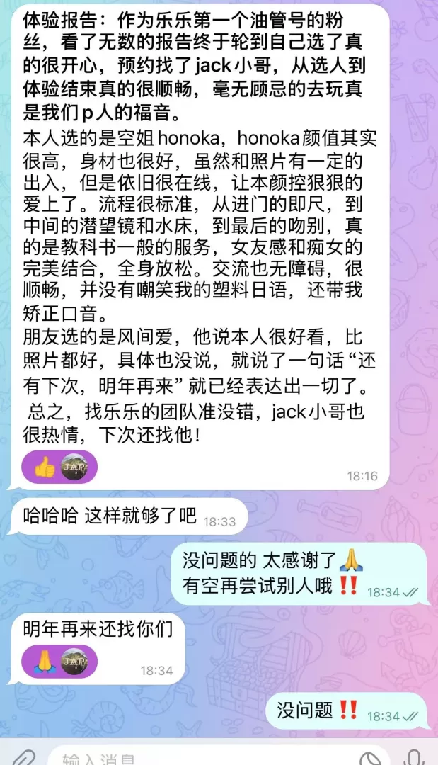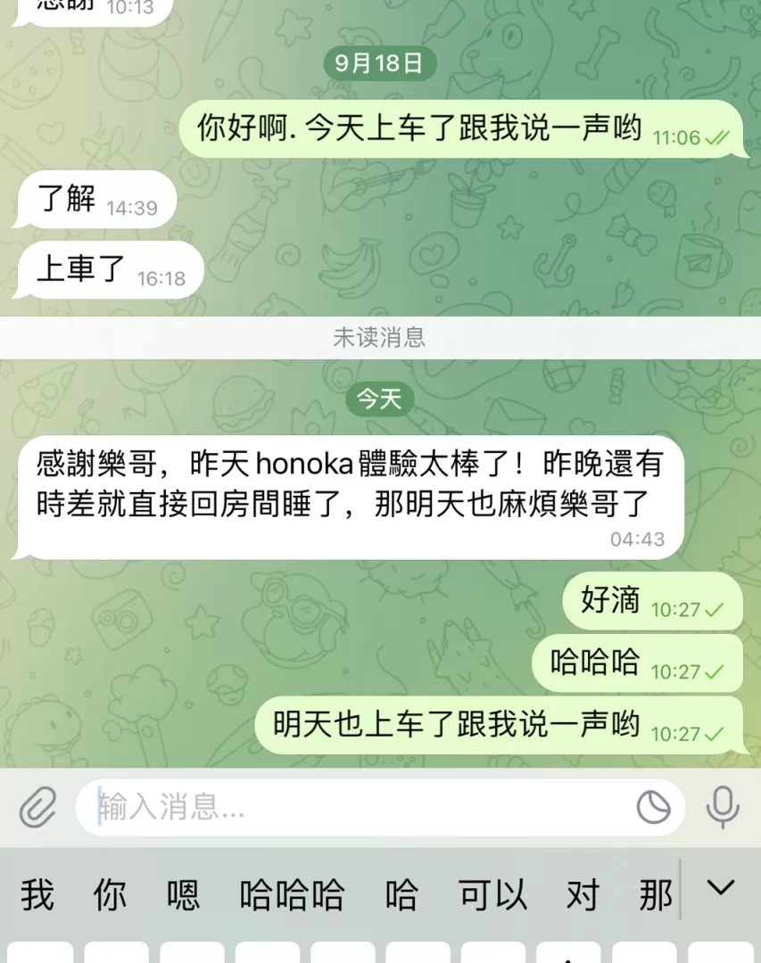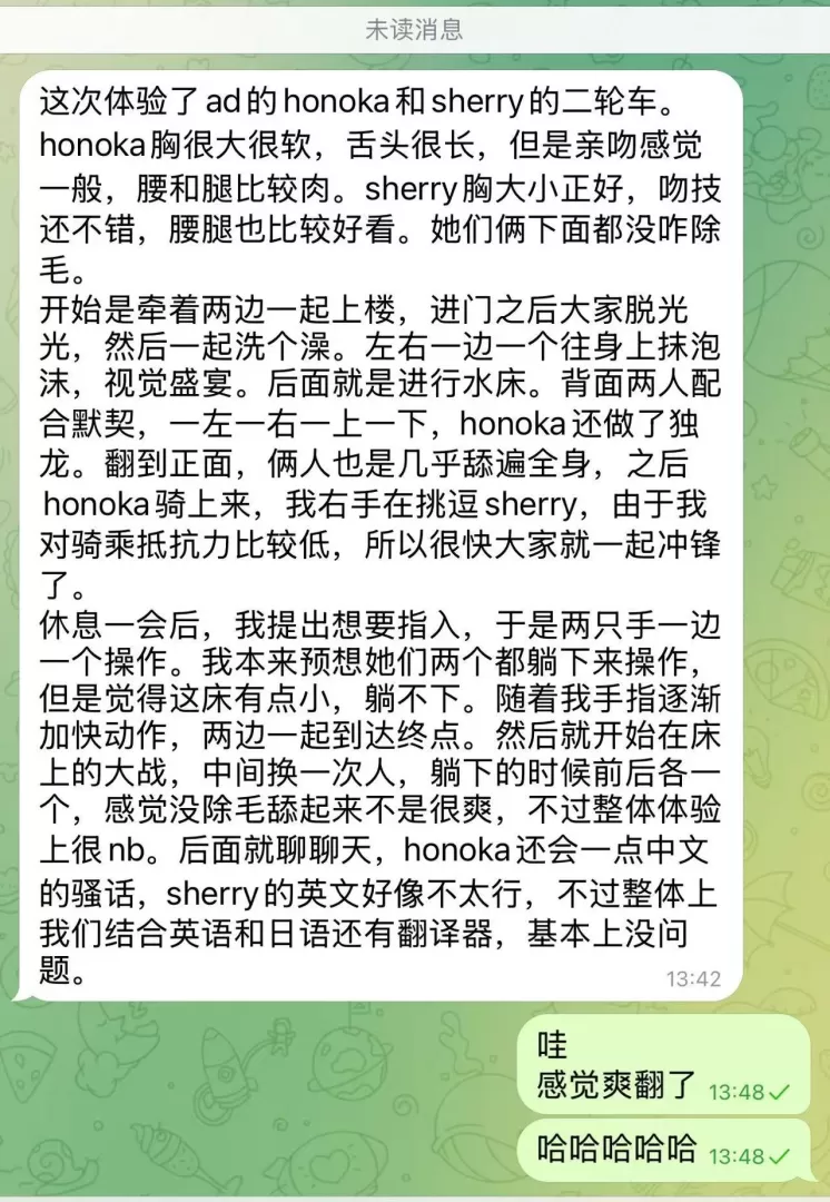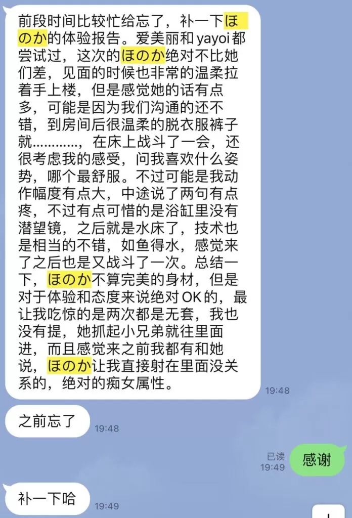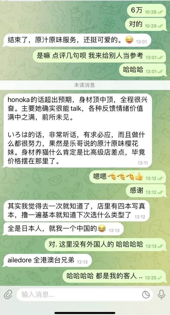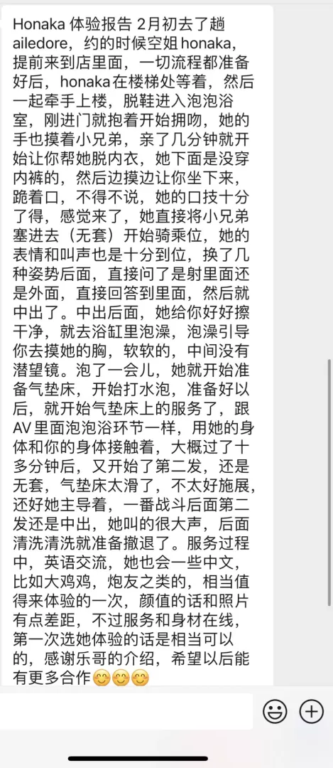 honoka的服务性是拉满的,之前一直很期待,但是只能说听人劝吃饱饭,honoka的颜值确实像乐乐哥说的一样比照片差不少。刚刚见面就是十指相扣牵上楼,honoka的英语可以正常交流,进屋之后先是调情脱衣服,然后直接开始即尺,这一块honoka很卖力,但是调情➕口的部分有点长,然后才是正戏。和之前老哥测评的一样是可以nn的。第一发在床上结束后就是色狼椅,这里确实建议大家先洗干净再去体验,会给女孩印象更好,这次也很幸运体验到了潜望镜。水床部分应该是honoka的强项,体验拉满,特别是舔gang这个项目之前完全没想到,惊喜感拉满。后面第二发是从水床上再到床上,过程可以感觉到honoka很卖力,包括女上过程中不用动就能把我榨出来。但是营业感有点重(喘息稍微有一点点假),而且她很怕痒,过程中要是碰到腋下的部分会把我的手挡开,稍微影响体验。总体来说想体验完美的水床➕大胸的,选honoka没错了