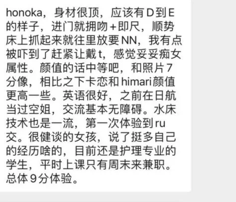 honoka 的话,⻅面非常热情,十指相扣上楼,正常流程即尺,然后女上 摇出来,可以 nn,之后唠了一会动漫,就开始水床了,没有潜望镜,但 是水床的表现要比 yayoi 好,yayoi 的嘴是吸尘器的话,那 honoka 的嘴 就是拔火罐,整个水床时间要比 yayoi ⻓,也是爽到⻜起。美中不足是 水床上做的时候手不能碰上半身,导致我有点发挥不出来(其他兄弟也 说过这个问题)最后给我口爆了,然后再好好洗洗就穿衣服了。