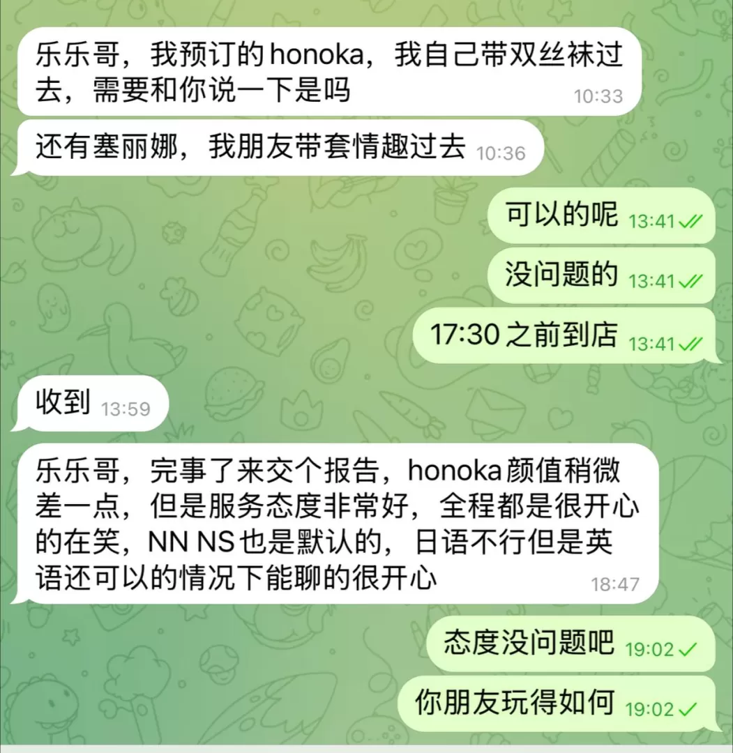 进入房间后直接就开亲,然后她帮忙脱下裤子后就开始口交,即尺成就解锁。然后顺势直接被她推倒在床,全部脱光后她直接握着几把就往身体里塞,由于之前知道她这里默认是无套的所以也没有反抗,直接在床上开战。进行了十几分钟后突然被叫停,然后被她引导到小板凳上开始色狼椅洗澡。之后浴缸环节她会一起进去,这里也提供了潜望镜服务。水床上她的服务应该算是顶级了,感觉身体的一切角落都被她舔遍了,并且HONOKA酱的舌头非常之长,在毒龙环节直接爽上了天,她一边撸一边毒龙险些没抗住直接发射了。水床上以女上姿势开始做爱,如其他兄弟所说这里不让碰胸,手比较尴尬不知道放哪,不过由于无套,被她夹的很舒服,最终也是顺利完成第一发。休息环节简单聊了聊她的客人情况,她的中国客人相当之多,前一天甚至达到了5/5全部被中国人预约的状态。她应该是被很多介绍人或者旅行机构猛推的一位选手。接下来在床上,我问她是否可以口爆,她直接回了一句anyway is ok,瞬间就扛不住了。不过反复口了一段时间,一直没有发射的感觉,最终仍然选择了做爱的方式完成第二发。最后剩下的十几分钟里,她会比较主动地给你女友恋爱的感觉,跟你说一些情话,不过已经二度进入贤者模式了基本也没什么太大感觉。整体来说还是比较好的一次体验。