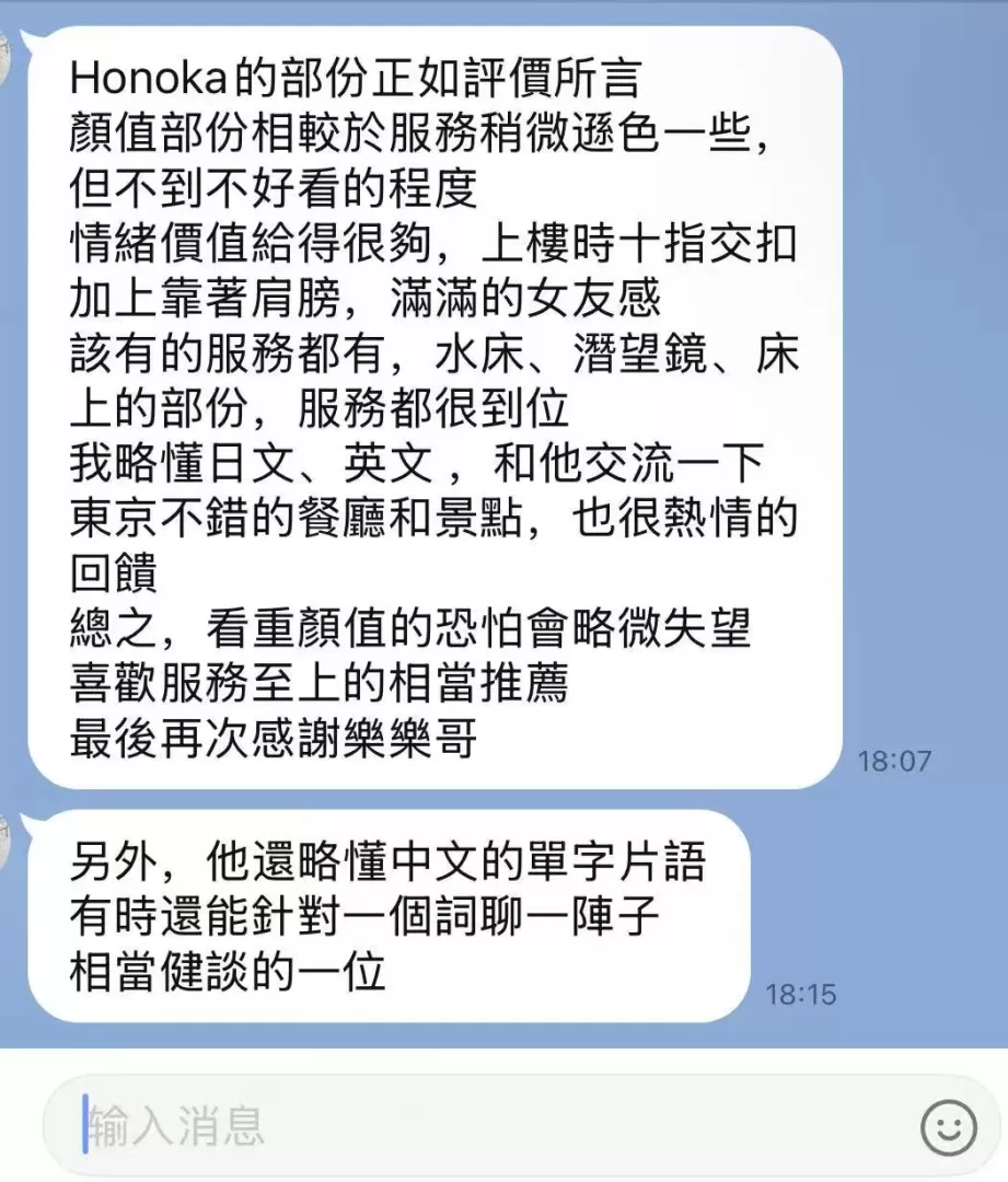 招待带我过去的时候,honoka已经在楼梯口等着了,上来就很热情。牵着手走上去,本身会一点日语所以交流起来基本没有问题。有些沟通不清楚的点她也会用英语解释,问了一下她觉得自己是店里英语最好的。进房间后就开始接吻,慢慢脱掉衣服然后开始第一波战斗。一开始是可以摸胸的,但是作战中间就和大家评论的一样不让碰了,手稍微靠近一点她就会把你的手挪开。第一次结束后就会点喝的然后聊天休息,泡澡。有一个戏剧性的事情是准备气垫的时候honoka发现气垫床坏了,有一块突起。她说昨天这个房间别的女孩用过了不知道谁弄坏了。但是不太影响使用。气垫床上honoka确实洗的很仔细慢慢悠悠的滑来滑去最后再来第二发。结束后帮清洗身体,穿上衣服后吻别。总体评价喜欢服务的值得一试,日语不好的也可以选择他比较好沟通,