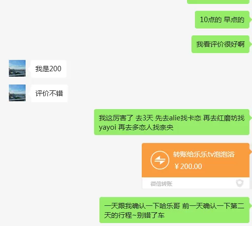 思考4:乐哥能为你做什么。乐乐是我见过最靠谱也最有耐心的泡泡浴联络人了!预约一次的费用200元人民币(Yayoi除外),国内可能就吃顿饭,但是他需要为你承担风险,因为女孩预约了你的时间,就要放弃其他客人,如果你放鸽子,乐哥需要为你支付这笔费用(违约金)。而且乐哥只负责回答泡泡浴相关的问题,需要高度注意:他不是导游!他不是导游!他不是导游!他也不是百度/Google!他不是百度/Google!他不是百度/Google!所以日本哪里好玩,哪里好吃,哪里推荐什么,大家都是成年人,自己去查好么!乐哥的工作就是告诉你心仪的女孩在你想去的时间段有没有空闲,帮你预约,给你安排车辆,提前一天和当天提醒你!至于你在店里消费了多少,他是没有提成的!选好后就像我截图里放的,确认好时间,直接转账就可以!