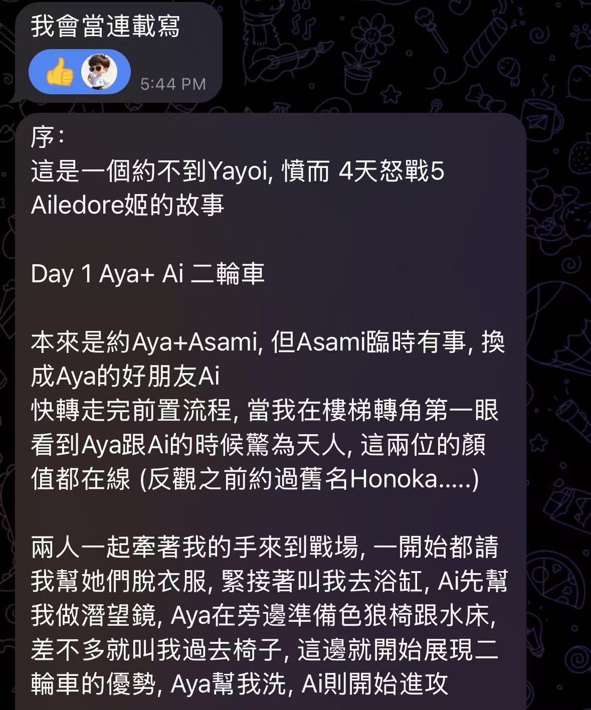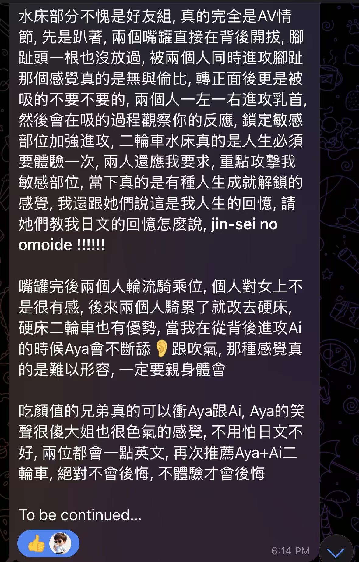 之後清洗的過程中也有按摩 卡戀按摩真的很舒服 我都有點快睡著了後來 再之後就是喝東西聊天 拆禮物 總結來說 兩人配合很好 全程沒讓我閒著 有點美中不足就是和愛的交流比較少 日文只學了兩個學期是硬傷 二輪真的很爽