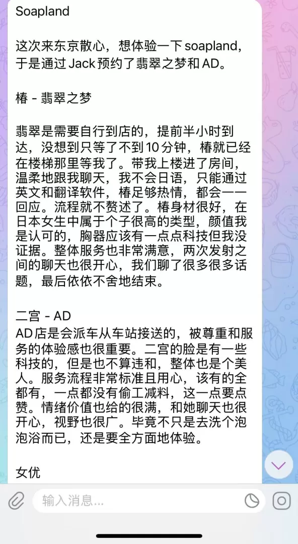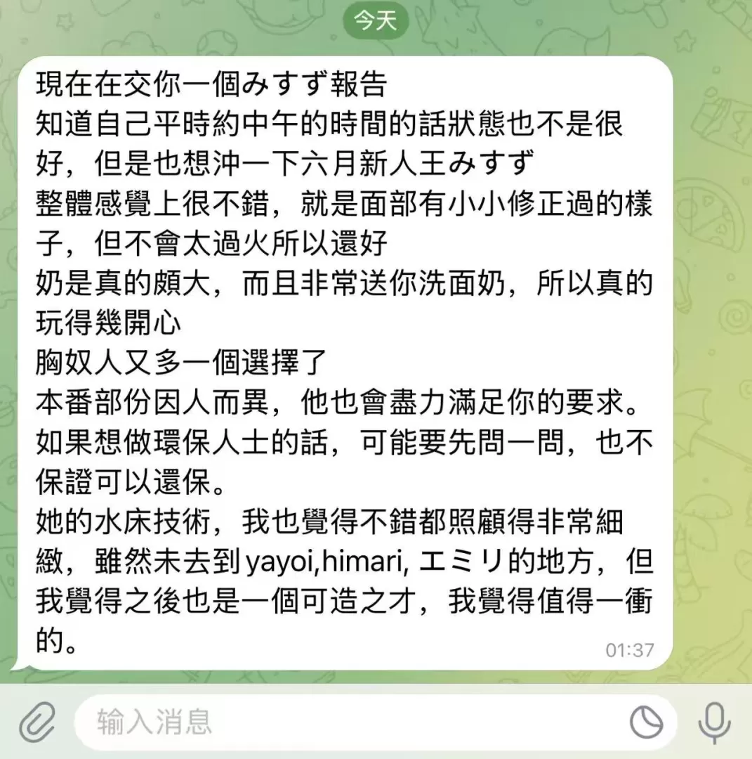 总体而言美铃酱的服务体验是比较超出预期的,在ad体验过的泡姬里应该属于排名靠前的选手了。身材颜值都在线,服务的话态度很好,配合度高,水床技术中等。而且参考前面的体验报告如果妹子状态好的话应该在服务上会更好一些(比如即尺毒龙这些),未来有成为新的红牌的潜力。推荐兄弟们尝试。