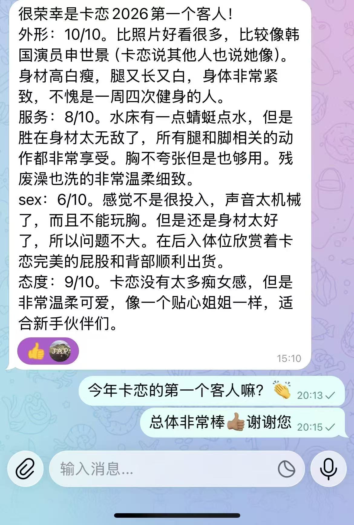 卡恋真人比照片漂亮!身材很不错,皮肤白且滑。进门有即尺,她今天可能比较累,服务比较划水,流程化很严重。脸头发不能碰,脚和乳头不让碰。外貌协会的兄弟闭眼冲。追求服务的兄弟可能要考虑一下。今天整体不错,但是低于预期