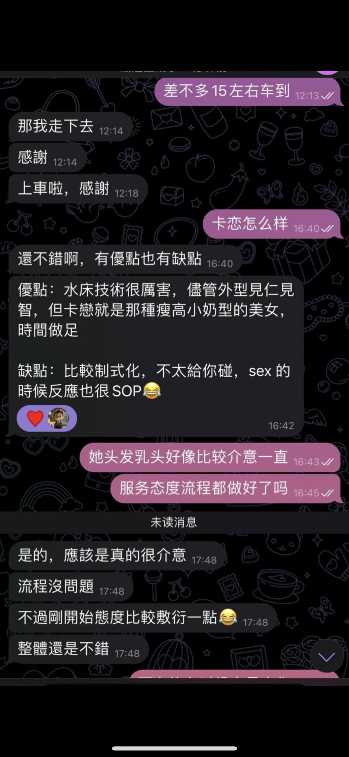 給完錢出等待室かれん和あい就在樓下等著 先說愛是基本和新的照片很像 胸不平!不平!看起來像剛出社會的學生妹的感覺 但愛的英文不太好 卡戀和照片不太像 很高 很瘦 胸a 但也屬於顏值在線 略微高冷臉同時卡戀全程負責聊天 當然還有服務 回到流程上來 上了樓送了小禮物 卡戀先介紹流程 問了我喜歡哪些玩法 我也問了她們哪裡不能碰 主打一個相互尊重 先床再水床 脫了衣服愛攻上路 卡戀下路 換了幾個姿勢搞定第一發 這裡說下愛很主動 可以🐍 然後愛陪我去泡澡 有推 有潛望鏡 然後椅子 大家一起洗乾淨哈 過程該有的都有 二輪主打一個享受翻倍 然後繼續愛陪我泡澡 卡戀這時去準備水床 然後重點來了 水床 愛在左邊 卡戀右邊 左上右下 右上左下 感覺她們倆配合好好 各種吸各種舔 反正敏感點沒有一刻是閒的 唯一沒辦法是我手不能動 這是硬傷 轉正面後 av裡面的場景此刻呈現在我眼前 左卡戀 右愛 趴在我身側繼續滑 繼續舔 手也不停 之後狀態來了愛騎上來順勢第二發 之後清洗的過程中也有按摩 卡戀按摩真的很舒服 我都有點快睡著了後來 再之後就是喝東西聊天 拆禮物 總結來說 兩人配合很好 全程沒讓我閒著 有點美中不足就是和愛的交流比較少 日文只學了兩個學期是硬傷 二輪真的很爽 搶推有實力的兄弟們一定要至少體驗一次 提早選人 至少保證一個是能語言交流的 兩倍的價格 不止雙倍的快樂 最後再次感謝樂哥幫我安排