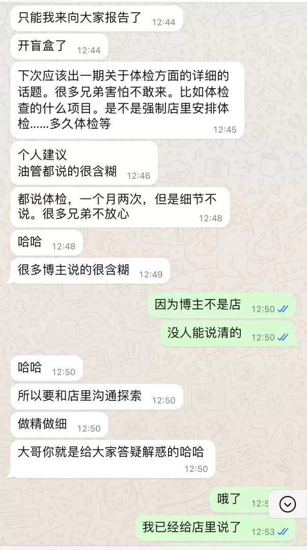 起因是这样的,有个哥们儿预约泡泡浴时问到了关于泡泡浴是否有体检报告这一说,我本人,包括基本全网的博主,以前只是给大家说,有体检报告,但是时间周期呀,到底做哪几项呀,之类的比较详细的情报,都是没有的,所以导致很多人也是处于观望状态,也体现不出泡泡浴作为风俗之王的严谨与相对的安全。