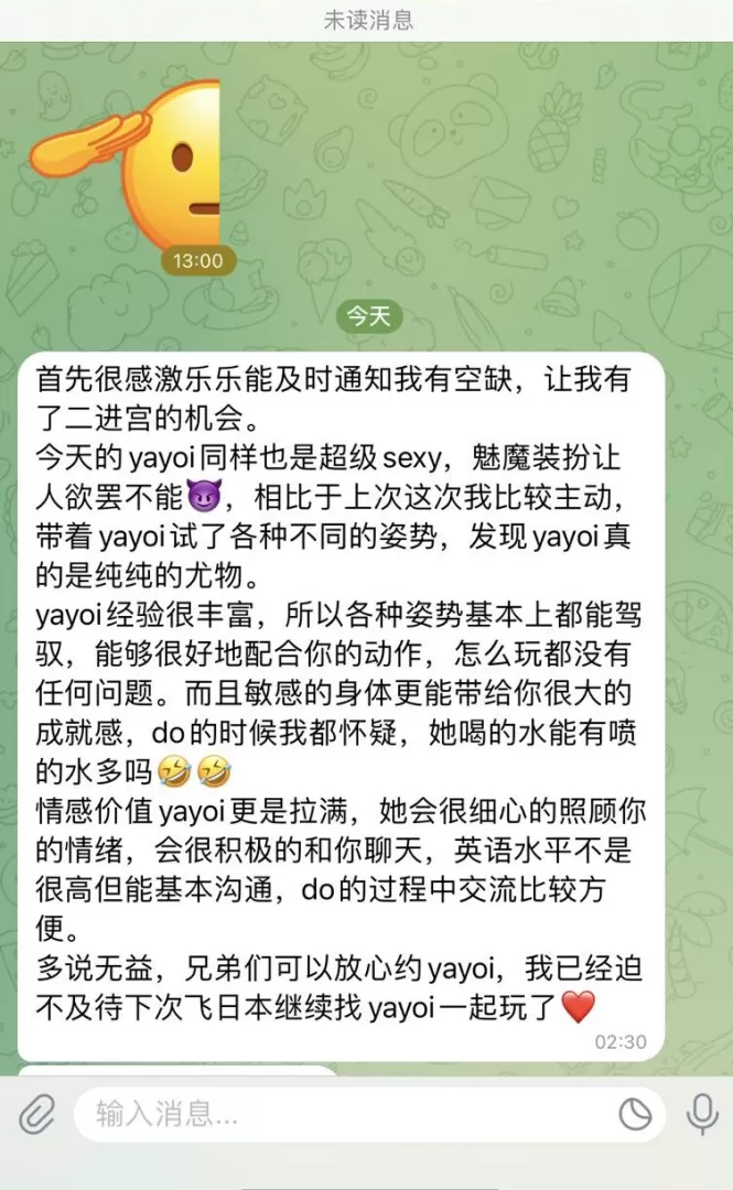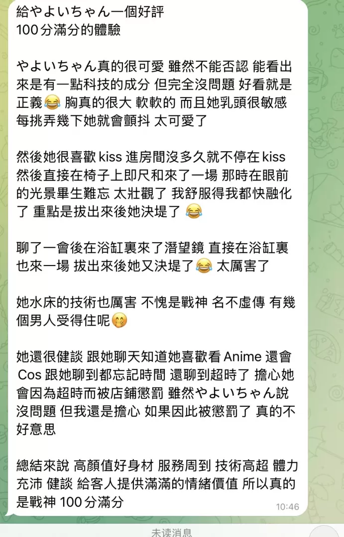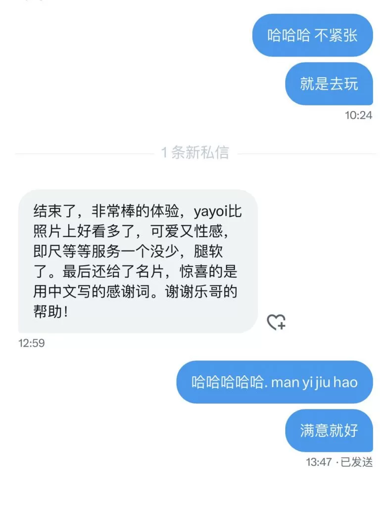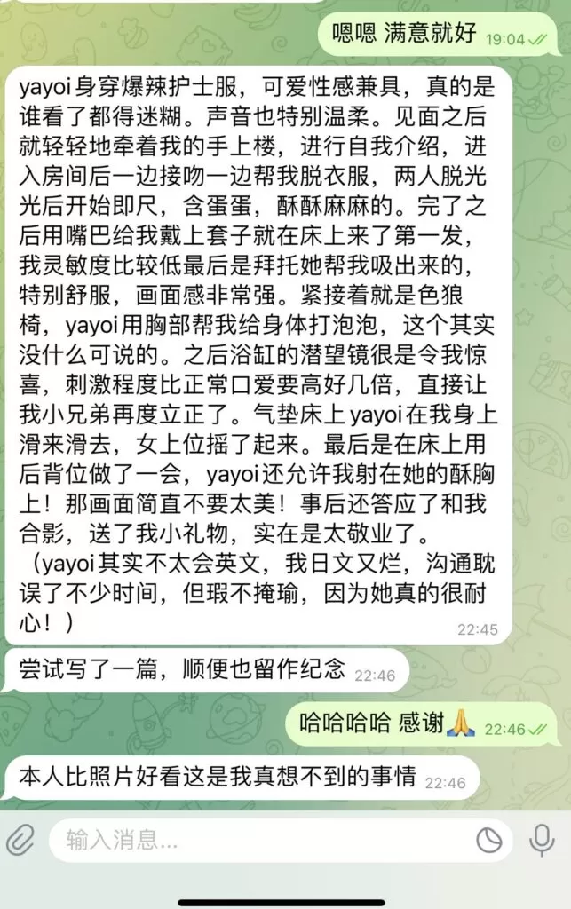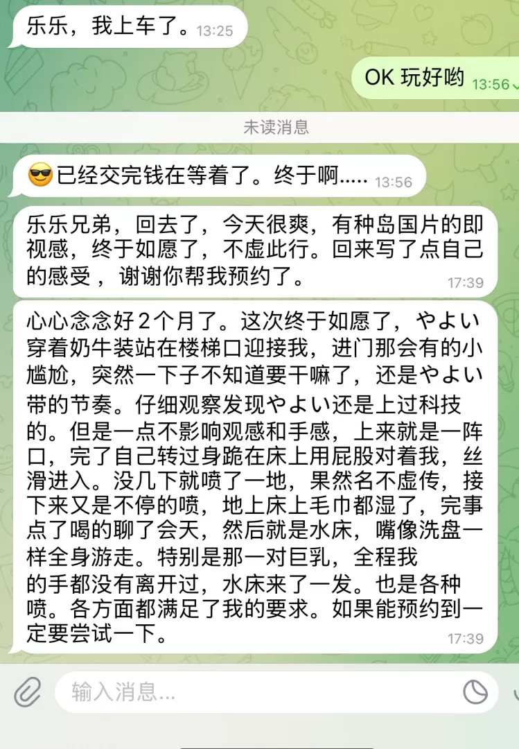 去年因为yayoi得流感了,错过了一次。这次期待已久了的yayoi终于体验到了。关注了乐乐哥很久了,yayoi一直以来好评如潮,果然没有失望。先说样子吧,图片和真人基本无异,百分之九十九一样,可能脸看图片稍稍胖了点,但是真人百分百瓜子脸。装束感觉很花心思,黑色兔女郎装扮,加上那巨乳真的让人瞬间就有感觉了,身材也很好,虽然不是那种模特身材,但是那双巨乳已经可以让你忽略那些东西了。进房间之后接吻,直接即尺,然后就直接骑乘位坐上来了。很不争气,很快就出来,可惜不是在床上,是在椅子上,体验感有点差,大幅度动作有点困难。然后中途休息,喝了点东西就先洗澡,然后浴缸那里潜望镜也有。本来她想直接在浴缸来一发的,可惜浴缸有点小不太方便,就放弃了,直接进入水床部分。水床技术真的很顶,边游龙边添,还有毒龙。最爽的部分还是乳交,本来浴缸那里已经让她弄得很硬了,那双巨乳直接给她干了一发出来,那感觉真的爽的难以言表。后面看到她看了一下时间,想再满足我一次,口交,足交,乳交直接给我弄硬,在水床直接又来一次。躺在床上那个骑乘位,看着yayoi,还摸着那双巨乳,是真的享受。后面时间也差不多了,洗了一下,就完事了。总体来说真的很满意,同志们可以无脑冲,绝对不踩雷,会说日语的话,能加很多印象分的,个人感觉。如果要挑个毛病的话,感觉口活没那么好吧,以AV女优作为对比,但是看到她也是很努力了。同志们冲吧,能约上就别错过了。