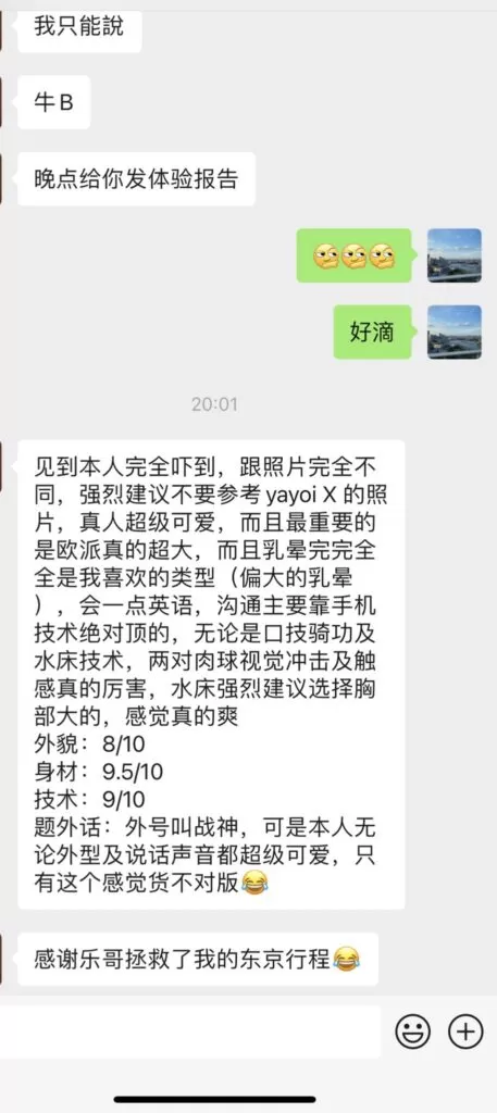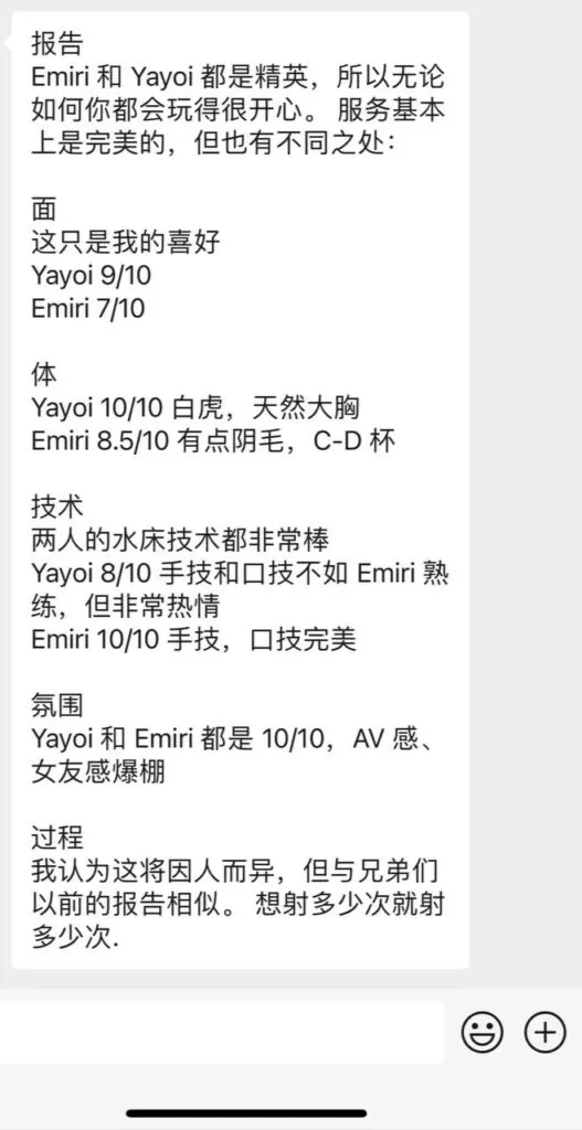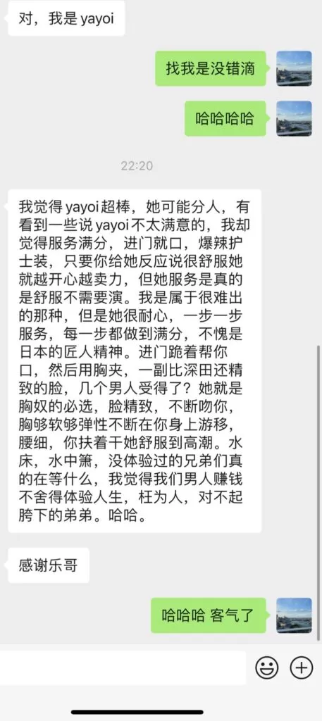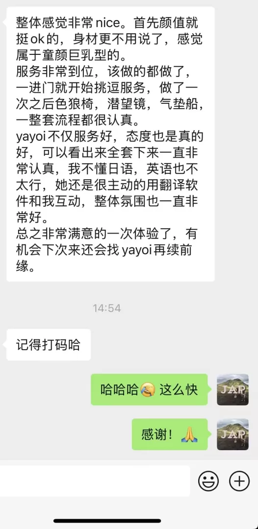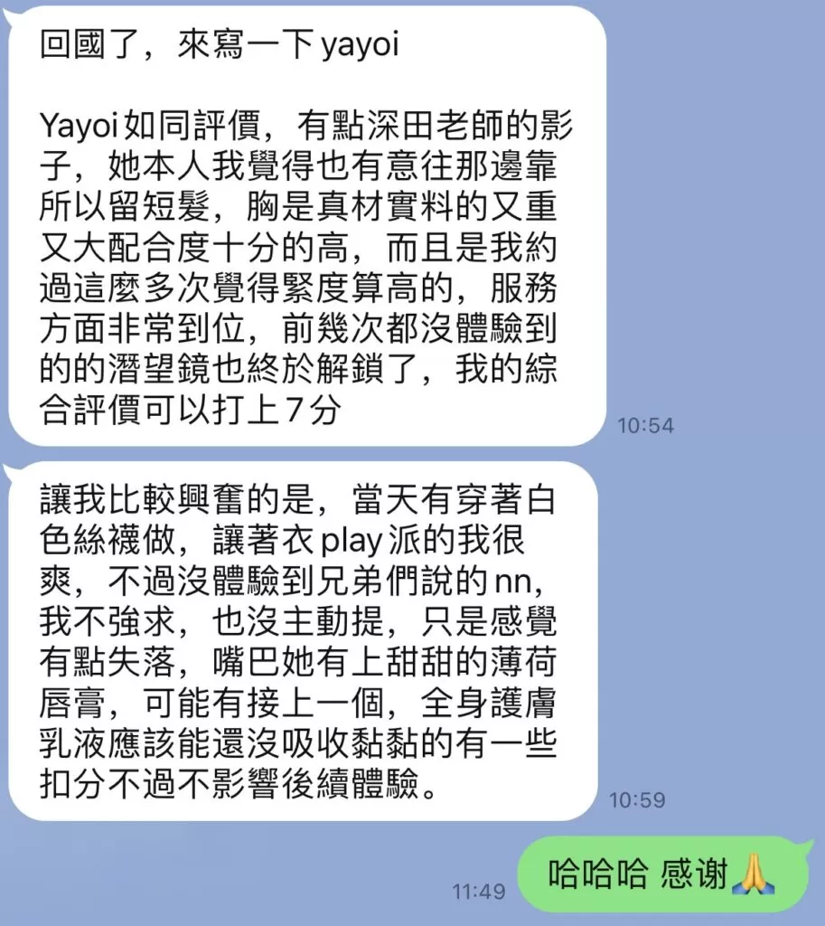 首先Yayoi的颜值要比之前所有店内的照片都好看很多,甚至比一些她个人发布的精修过的写真还要好看一些。身材极度炸裂,胸又大又挺,屁股也很大相当有肉感。个人感觉Yayoi是属于微胖型的,整体都比较有肉感。虽然个子小但体力相当好,大部分时间都在女骑乘位自己动,完全不会说累。英语一般但是在休息期间非常主动地用翻译器沟通找话题,绝对的满分体验。
