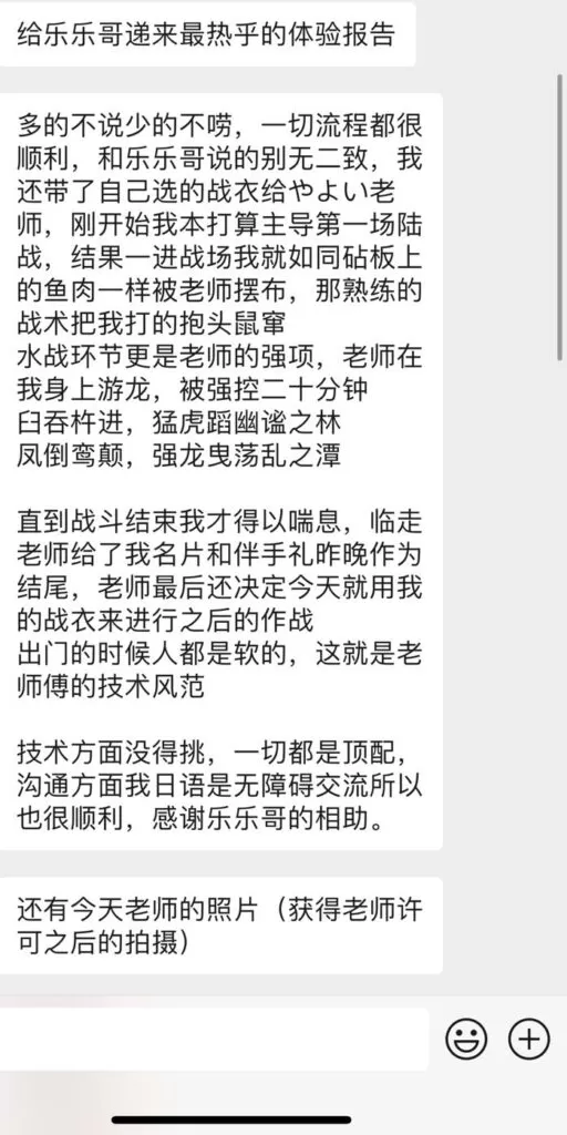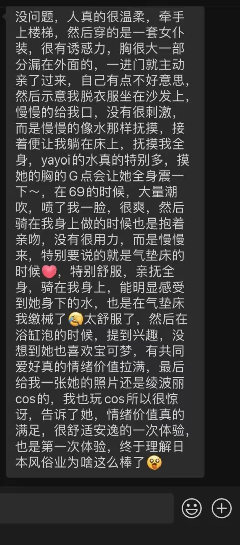 紫乃真人比照片还漂亮,脸虽然是圆的,但是很小,看着非常卡哇伊,身材也是顶级,胸大腰细、又白又滑,单论颜值的话是三人中我最喜欢的,不过需要注意的是紫乃正在矫正牙齿,有带牙套。另外紫乃女友感也很强,很会找话题不说,在交流的过程中还会有一些亲昵的小动作(比如突然亲你一下,突然在你身上摸一把)增加亲近感,搞笑的是我们聊着聊着她突然给我夸起自家店铺来,说自家店铺是吉源“第一”的泡泡浴店,女孩子很多质量也很高之类的,把我给整笑了。紫乃虽然不做水床,不过她会给你做个马杀鸡,个人感觉也不错,不比水床差。紫乃的缺点的话就是讲话环节太长了,给我有点偷钟的感觉,我这次做完第一轮,讲话,马杀鸡之后直接到时间了,第二发根本来不及做。。。