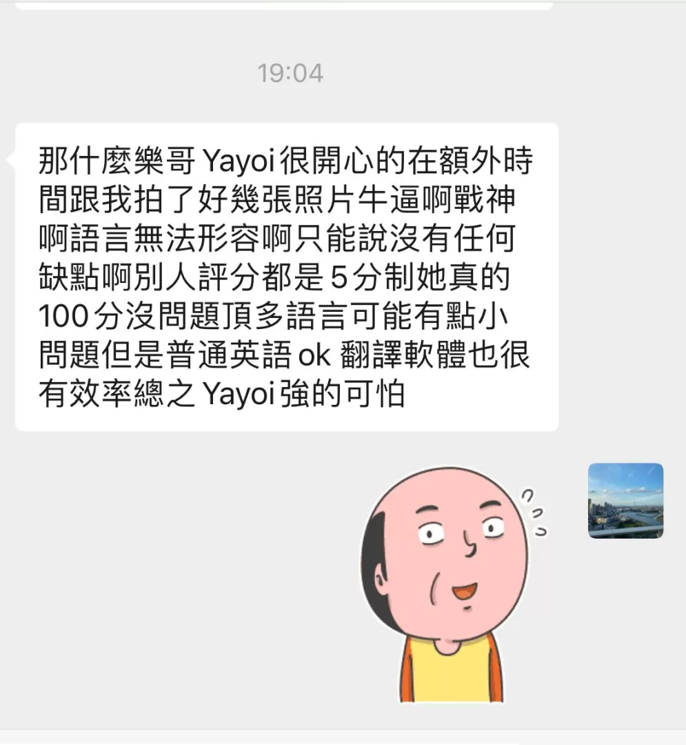 後面傾談她英語其實都不錯,我也懂一點點日語,所以主要是英語+日語溝通,全程沒用翻譯APP。談到我一會離開就要馬上去看演唱會,也談了那位歌星及歌曲,原來yayoi很喜歡短髮!兩小時很快就過去了。